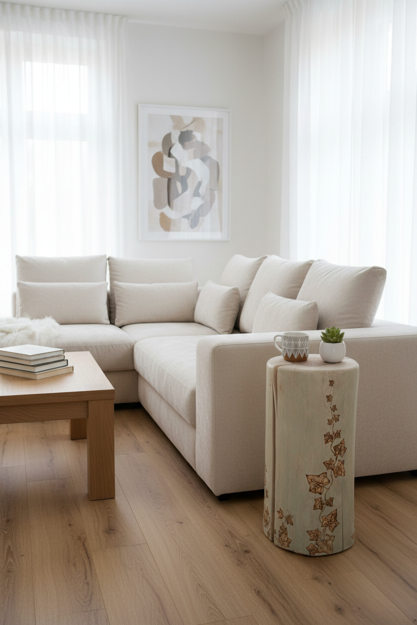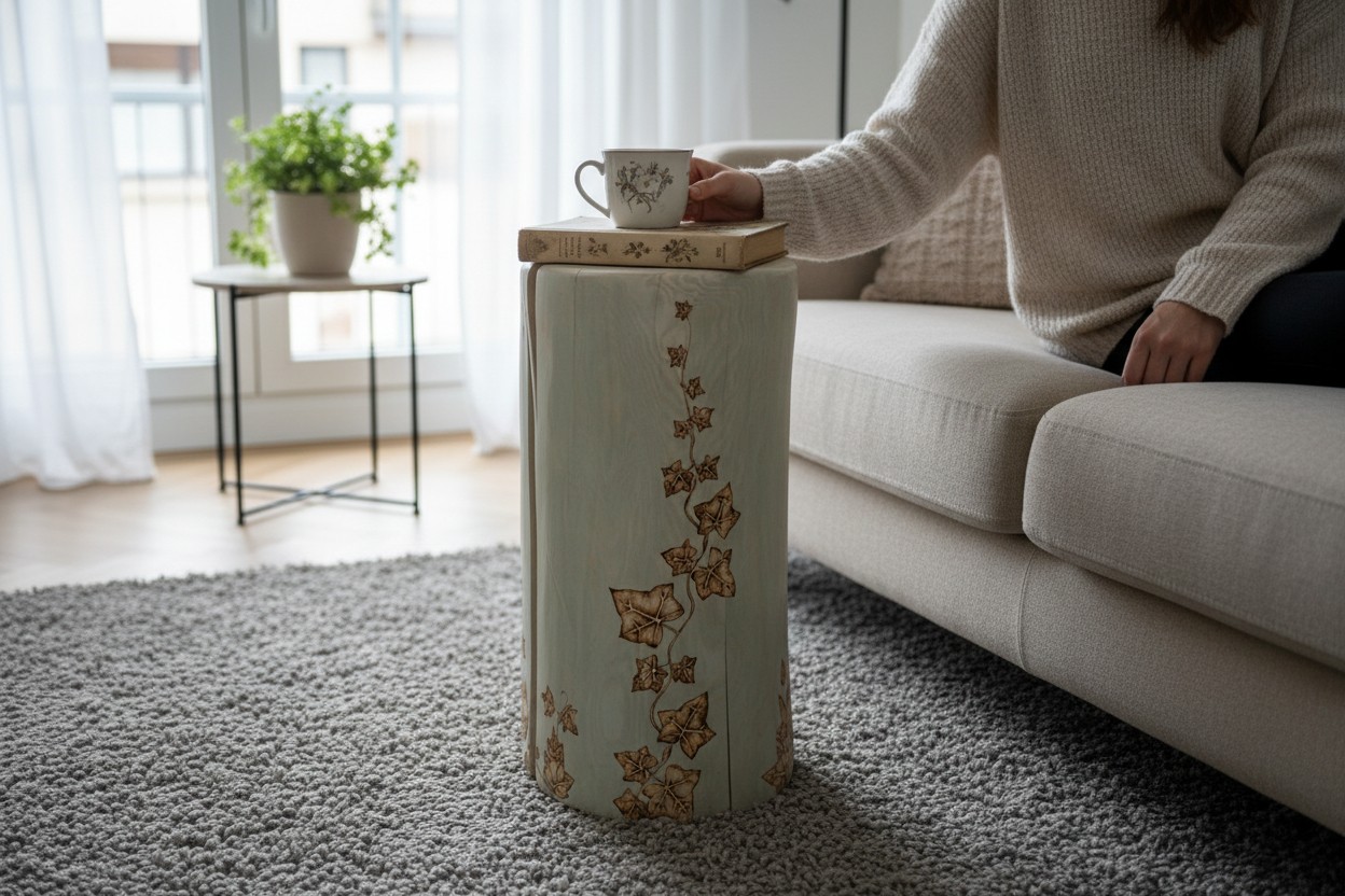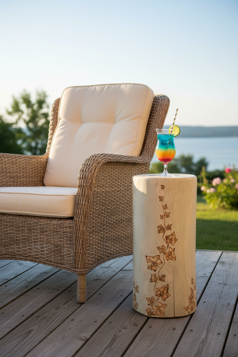 Jasanový špalek s vypálenými šlahouny břečťanu po celém obvodu se zeleným tónováním.