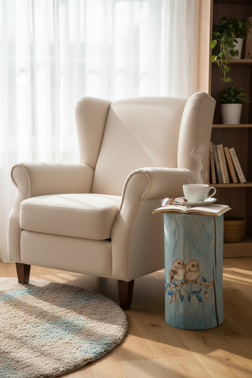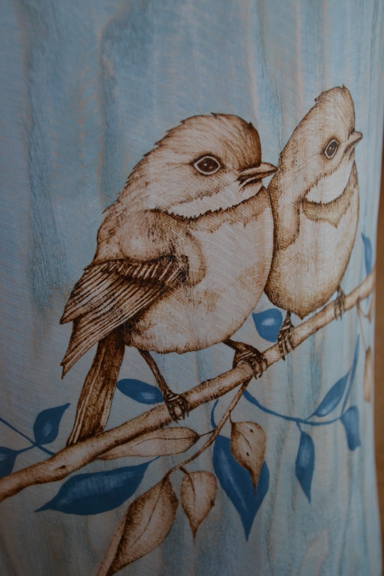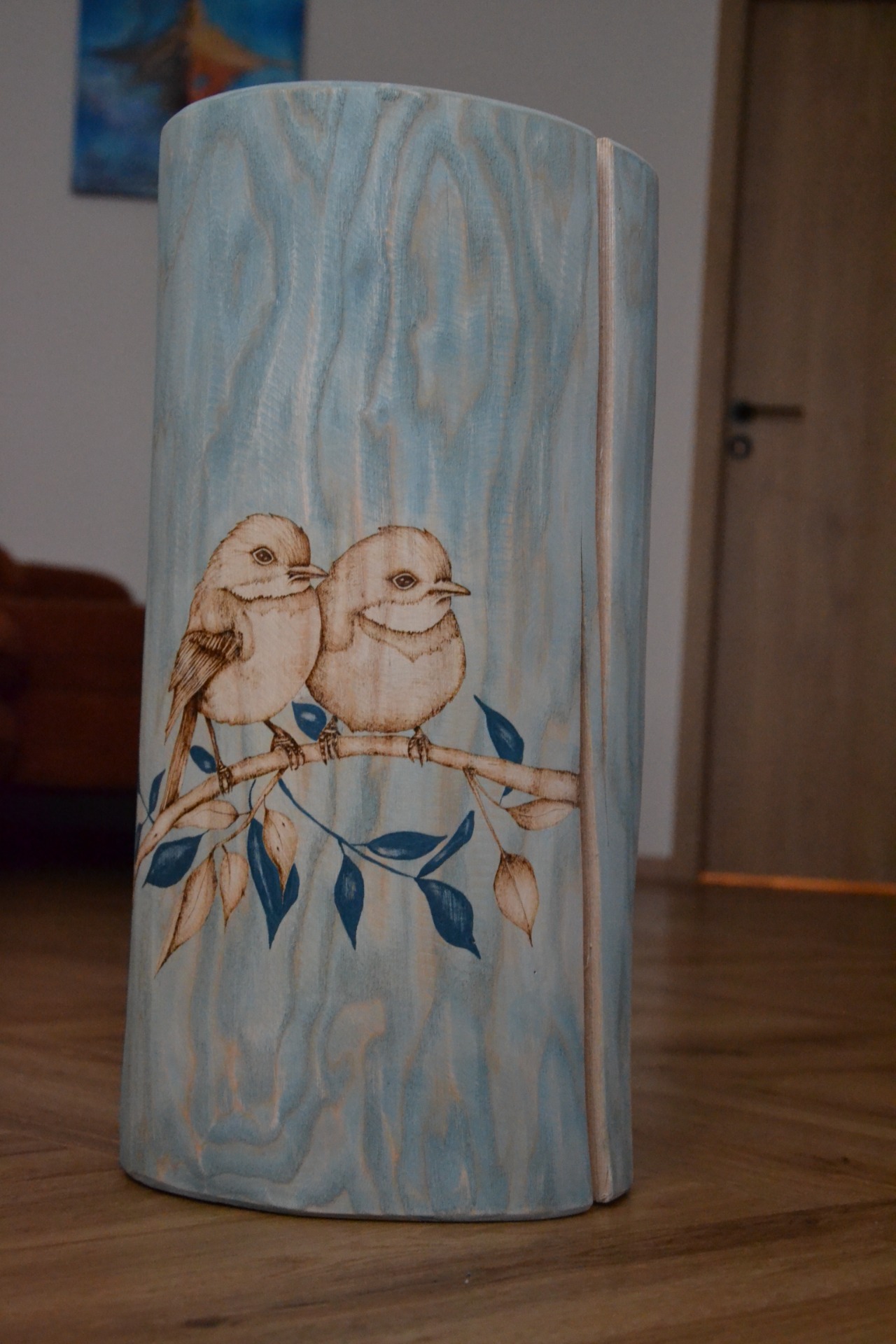 Jasanový špalek s vypálenými špalky a modrým tonováním.