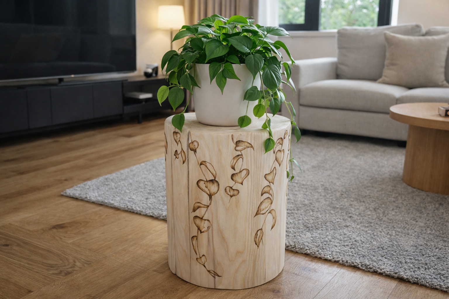 špalek s vypáleným motivem šlahounů popínavé květiny, přírodní barva